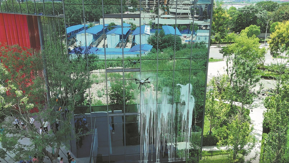 Guided by the Beidou Navigation Satellite System and laser radar, the drone operates on the most ideal route. It realizes precise control of the nozzle's angle and pressure, adapting to various building exteriors such as flat, curved, and vertical surfaces, to be able to cover 99 percent of the cleaning areas, Hu added.