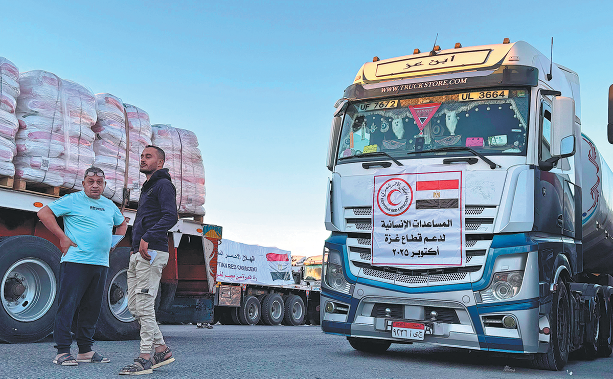Trucks loaded with humanitarian aid on the Egyptian side of the Rafah crossing wait to cross into the Gaza Strip early on Wednesday. The UN and aid organizations have urged the reopening of the major crossing as Gaza faces a devastating humanitarian crisis. AFP