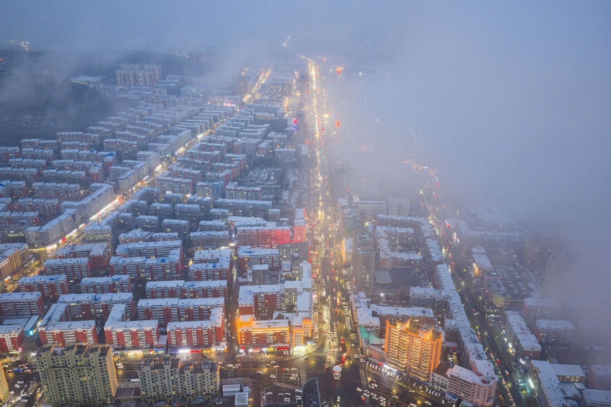 An aerial drone photo taken on Oct 15, 2025 shows a view of snowy Shuangyashan city in Northeast China's Heilongjiang province. [Photo/Xinhua]