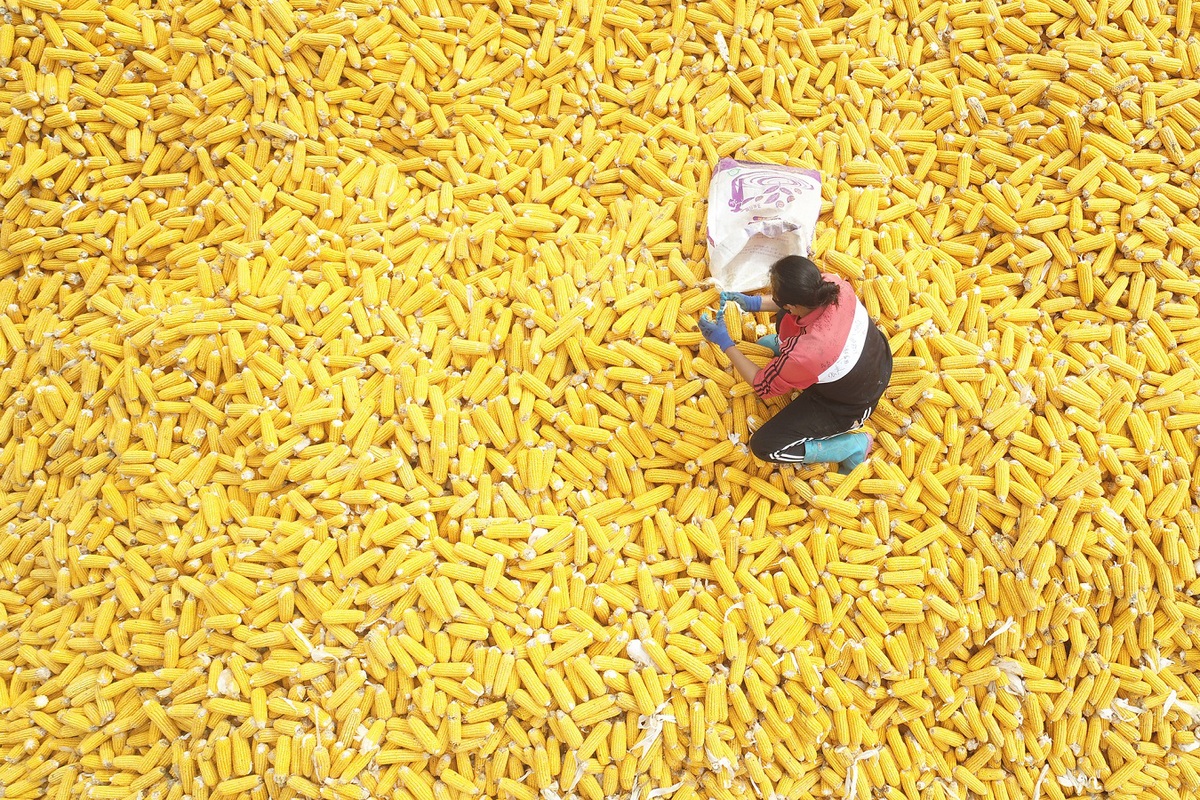 An aerial drone photo taken on Oct 11, 2025 shows a farmer arranging newly-harvested corn in Lugezhuang village, Tangshan city, North China's Hebei province. [Photo/Xinhua]