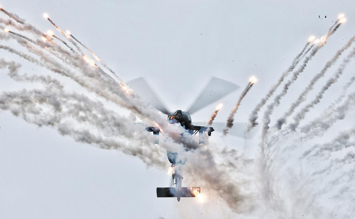 The Z-20T helicopter releases flares during its flight demonstration at the 7th China Helicopter Exposition in Tianjin on Thursday. TAO RAN/FOR CHINA DAILY