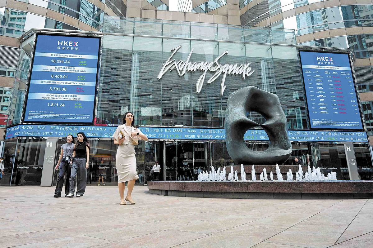 Displays show major stock indexes at HKEX's Exchange Square in Hong Kong. CHEN YONGNUO/CHINA NEWS SERVICE