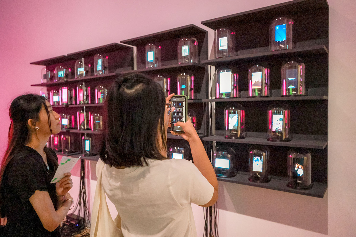 Guan Xiao's three-channel video Cognitive Space (2013) displays hundreds of random images in the shape of digital file icons, for a split second each, alluding to the sensory overload experienced in the digital realm. Guo Cheng's installation, The Weather Consensus (2022-25), reads varying weather data on the same city released by three different sources, to create a computational competition, with the "winner" preserved on the blockchain and displayed on a vertical digital screen.