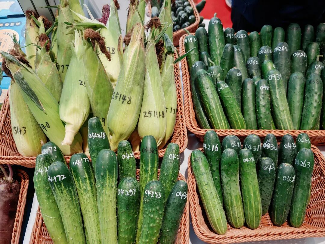Different varieties of cucumbers and corn are exhibited. [Photo by Yan Dongjie/chinadaily.com.cn]