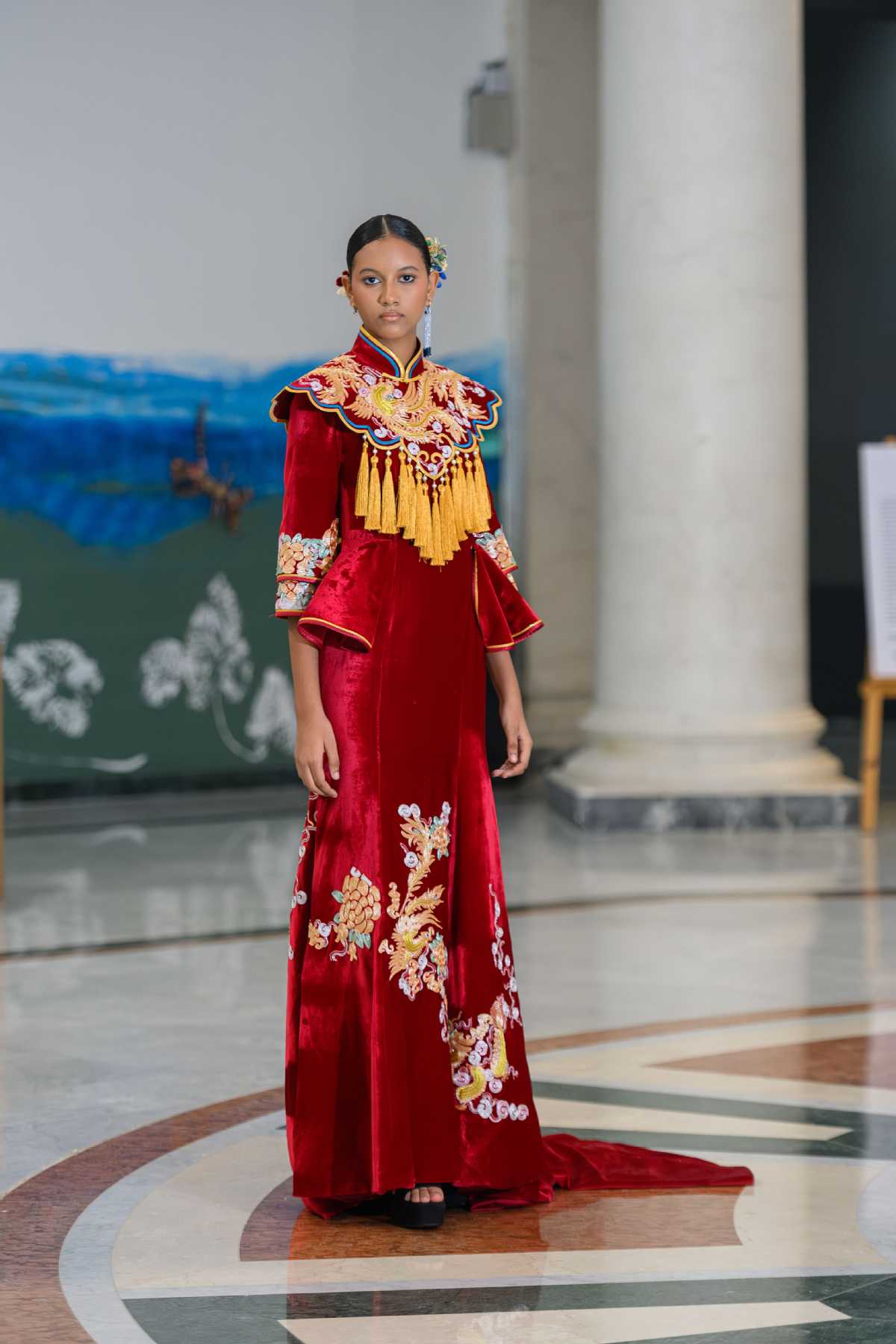 Gowns integrating traditional elements of Tujia brocades, Miao embroidery and gambiered Guangdong gauze designed by Zhou Zhaohui, president of Hunan College of Art, amaze the audiences in recent international fashion events. [Photo provided to chinadaily.com.cn]