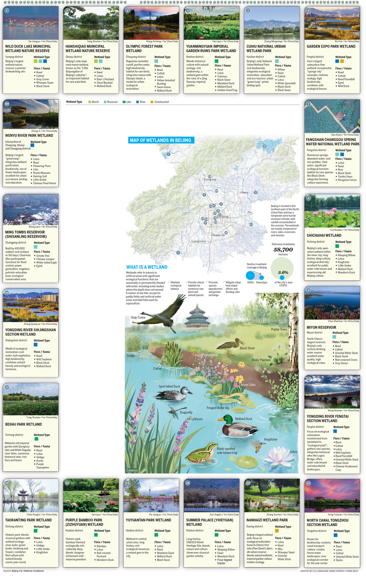 Among the inhabitants of urban wetlands are migratory birds. In Beijing, wetlands such as the Yanqing Wild Duck Lake and Miyun Reservoir host numerous migratory bird species, including the white-naped crane, common crane, mallard, and black stork. This year, World Migratory Bird Day, observed on Oct 11, called for collective efforts to create favorable living environments to secure the future of migratory birds in and around urban areas.