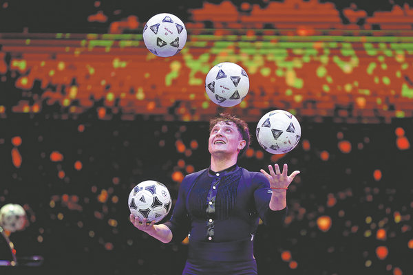 Chris Aguirre, an acrobatic artist from Chile, conducts a rehearsal before competition on Sept 30. [Photo by WU XIAOHUI/CHINA DAILY]
