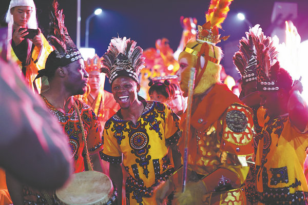 Chinese and Tanzanian acrobats interact in the acrobatic festival's parade on Sept 29. [Photo by WU XIAOHUI/CHINA DAILY]