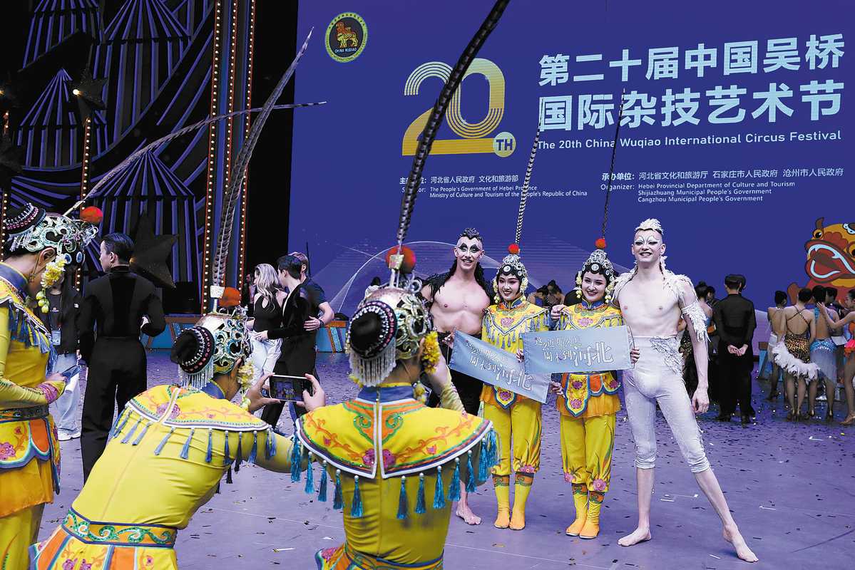 Chinese acrobats and their counterparts from the United States and Australia took a group photo after the opening performance on Sept 28. WU XIAOHUI/CHINA DAILY