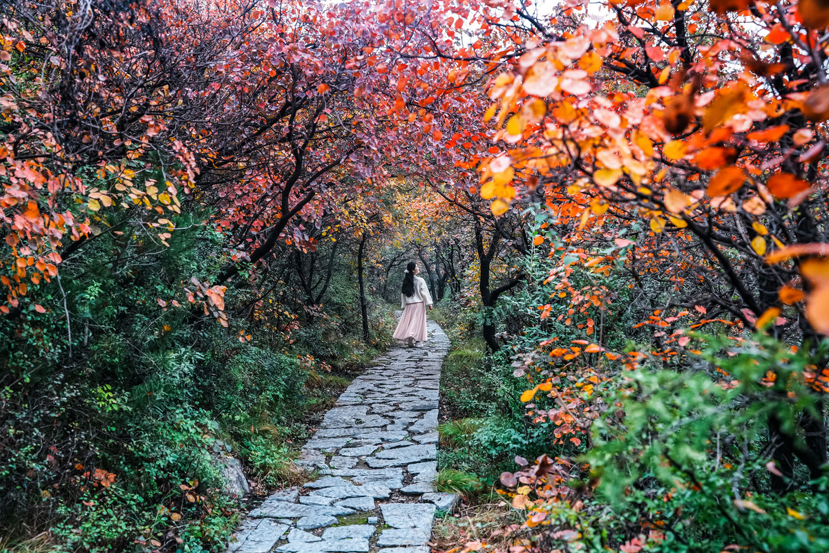 A drone photo taken on Oct 18, 2025 shows a woman enjoying the autumn scenery in Dadi village of Bo'ai county, in Jiaozuo city of Central China's Henan province. [Photo/Xinhua]