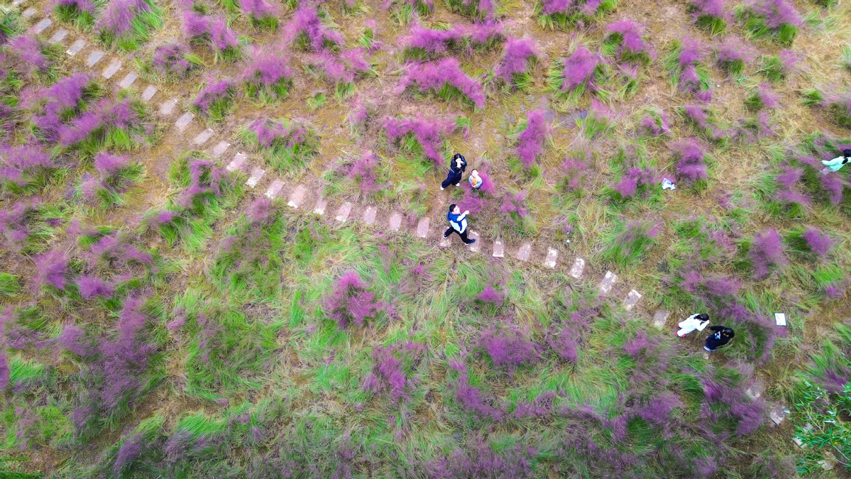 An aerial drone photo taken on Oct 18, 2025 shows people enjoying sightseeing at a wetland park in Luoyang, Central China's Henan province. [Photo/Xinhua]