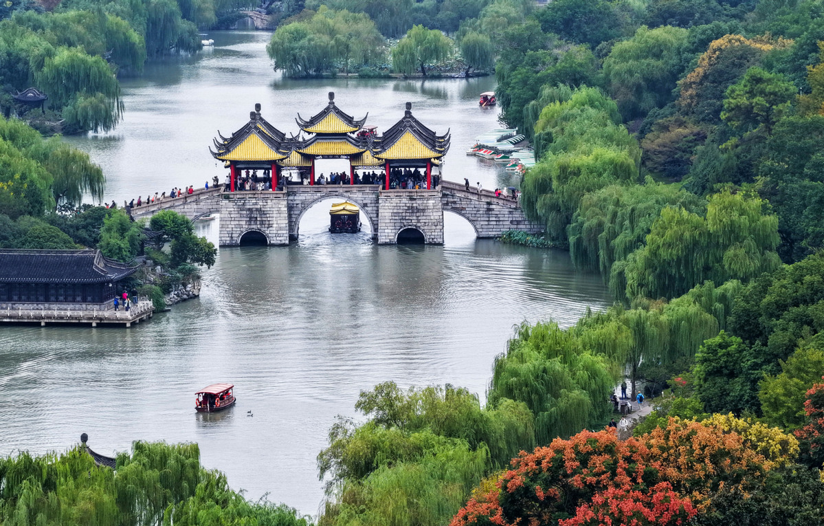 An aerial drone photo taken on Oct 19, 2025 shows tourists riding boats at the Slender West Lake scenic spot in Yangzhou, East China's Jiangsu province. [Photo/Xinhua]