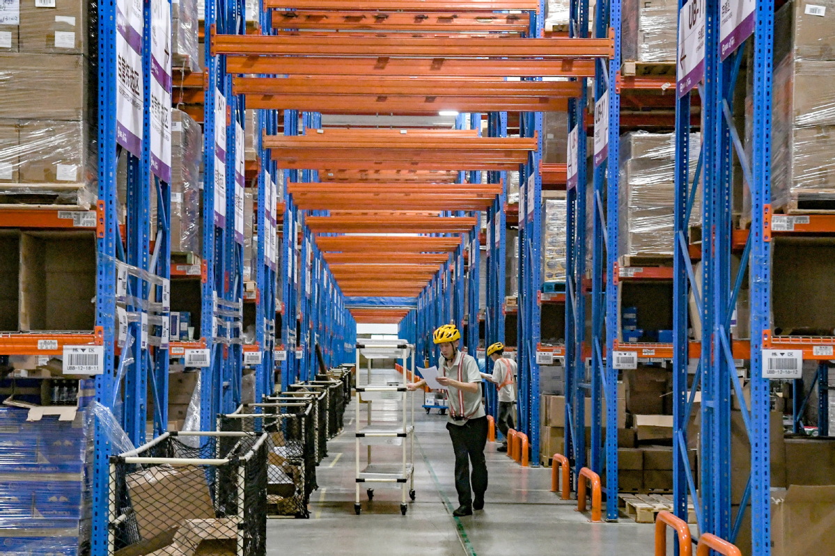 Employees sort goods at a cross-border e-commerce logistics center in Jinhua, Zhejiang province, in preparation for the upcoming shopping gala. SHI KUANBING/FOR CHINA DAILY