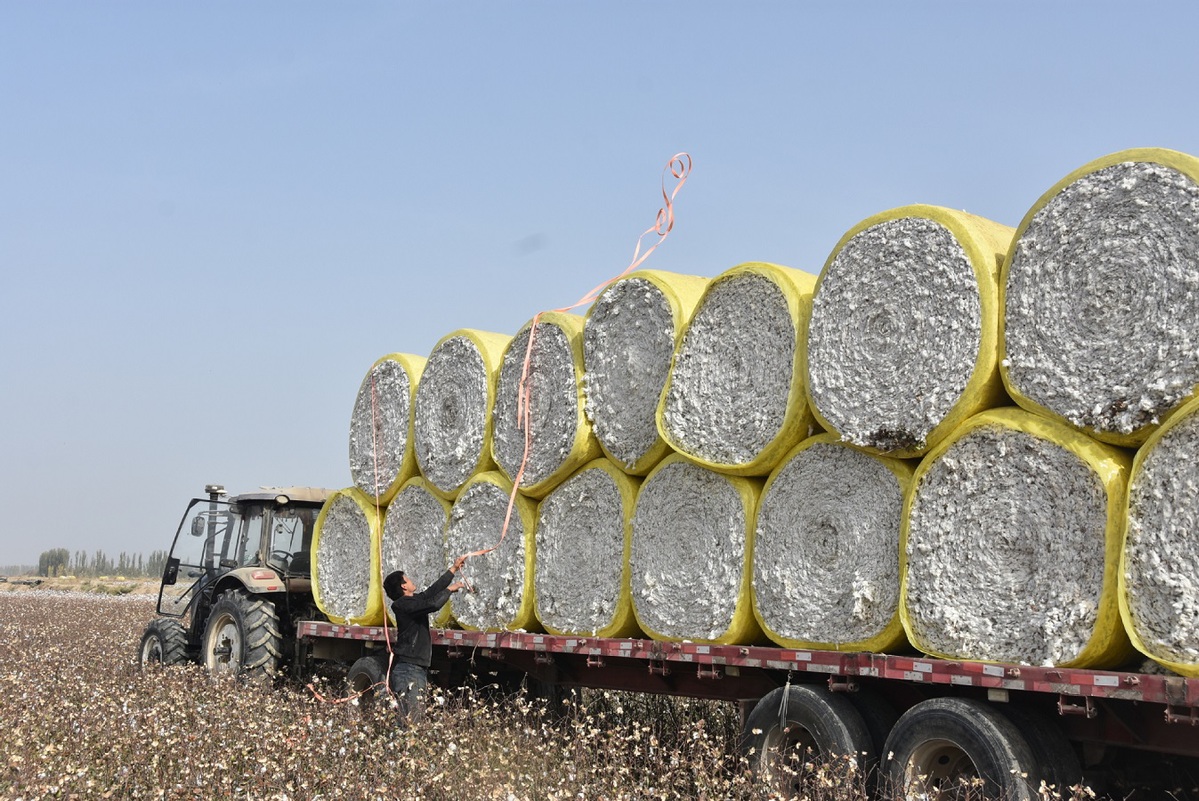 A villager loads bundles of newly harvested cotton in a field in Xayar county of Aksu, Northwest China's Xinjiang Uygur autonomous region, Oct 21, 2025. The harvest season of cotton has started in Xayar county. [Photo/Xinhua]