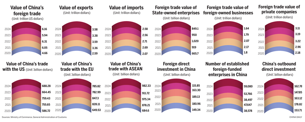 Meanwhile, China's trade with the Association of Southeast Asian Nations, Latin America, Africa and Central Asia rose 9.6 percent, 3.9 percent, 19.5 percent and 16.7 percent year-on-year, respectively. Trade with economies participating in the Belt and Road Initiative also climbed 6.2 percent year-on-year, accounting for 51.7 percent of China's total imports and exports — up 1.1 percentage points from a year earlier.