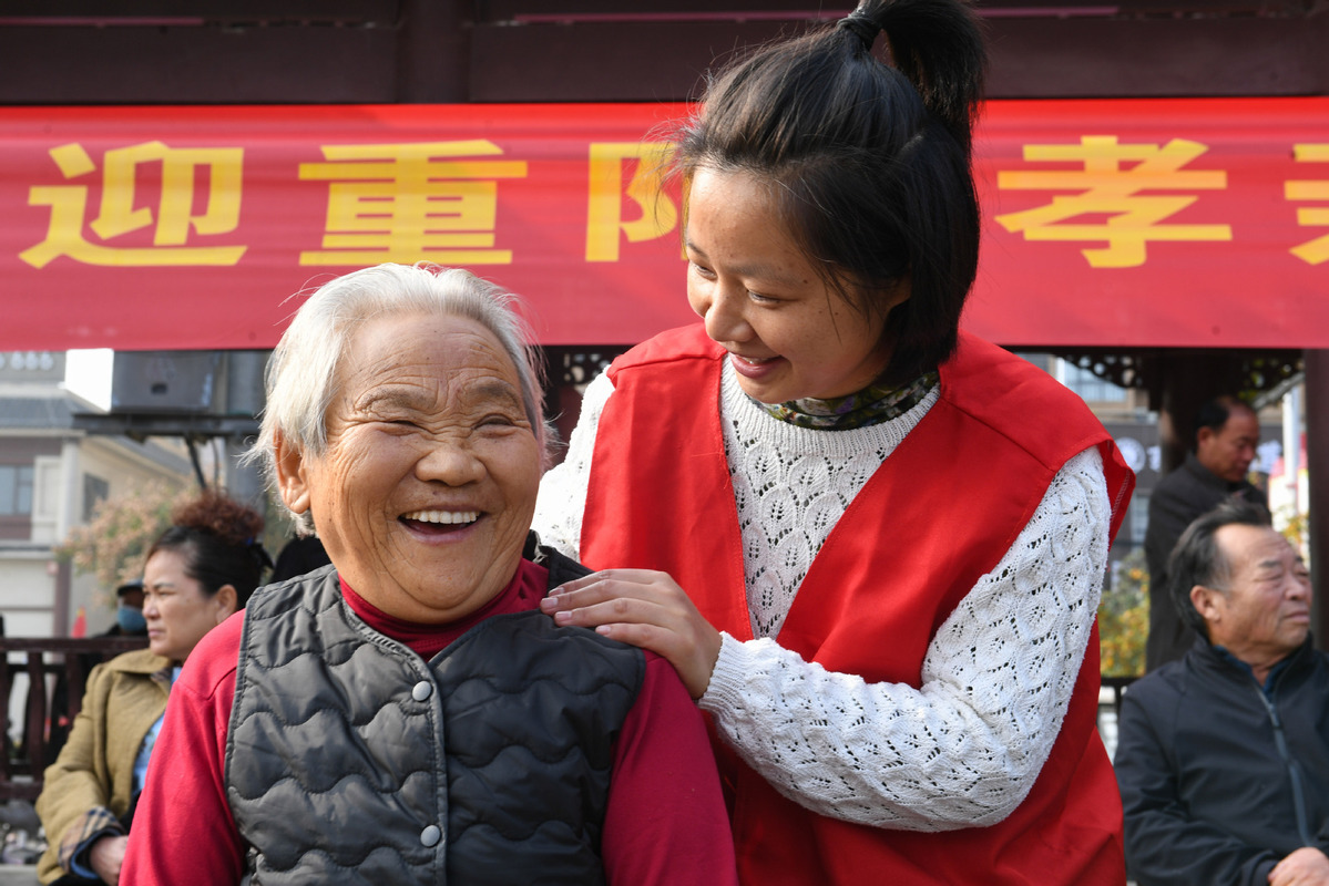 A volunteer massage shoulders of a senior citizen in Xiayi county of Shangqiu city, Central China's Henan province, Oct 27, 2025. [Photo/Xinhua]
