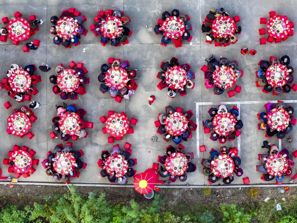 An aerial drone photo taken on Oct 26, 2025 shows a feast held for senior citizens at Magou village of Baimi town in Taizhou city, East China's Jiangsu province. [Photo/Xinhua]