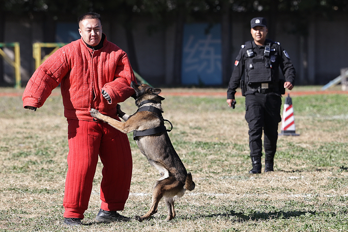 A dog participates in a contest during a police dog skills competition in Beijing, Oct 26, 2025. [Photo/Xinhua]