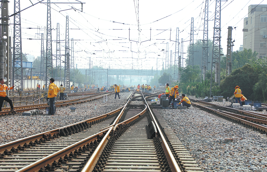 Employees from China Railway Construction Corp's 24th bureau renovate the signaling system for Fuyang railway station, a key transportation hub, in Anhui province on Monday. CHINA DAILY