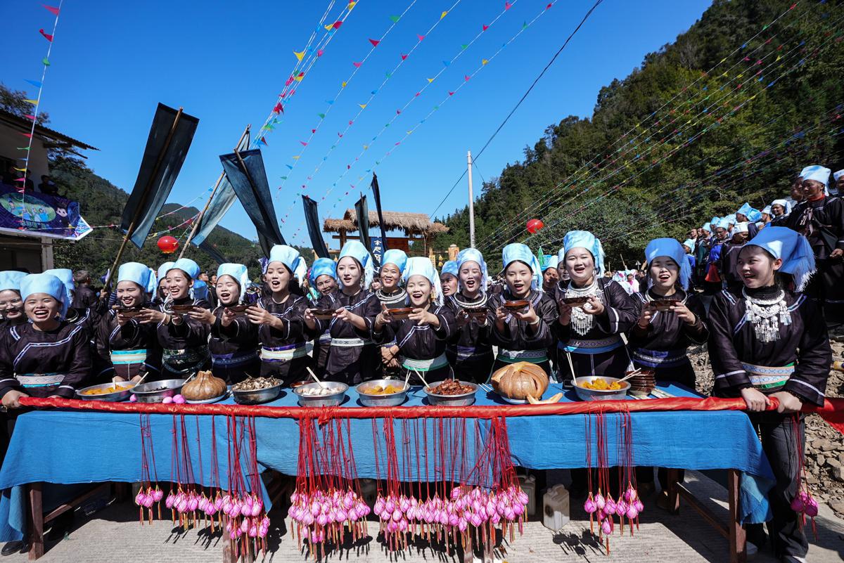 In late October, residents of Shui communities in Rongjiang county, Guizhou province, dressed in festive attire to celebrate Gua Festival, which marks the end of the autumn harvest. [Photo by Wei Guijin/For chinadaily.com.cn]