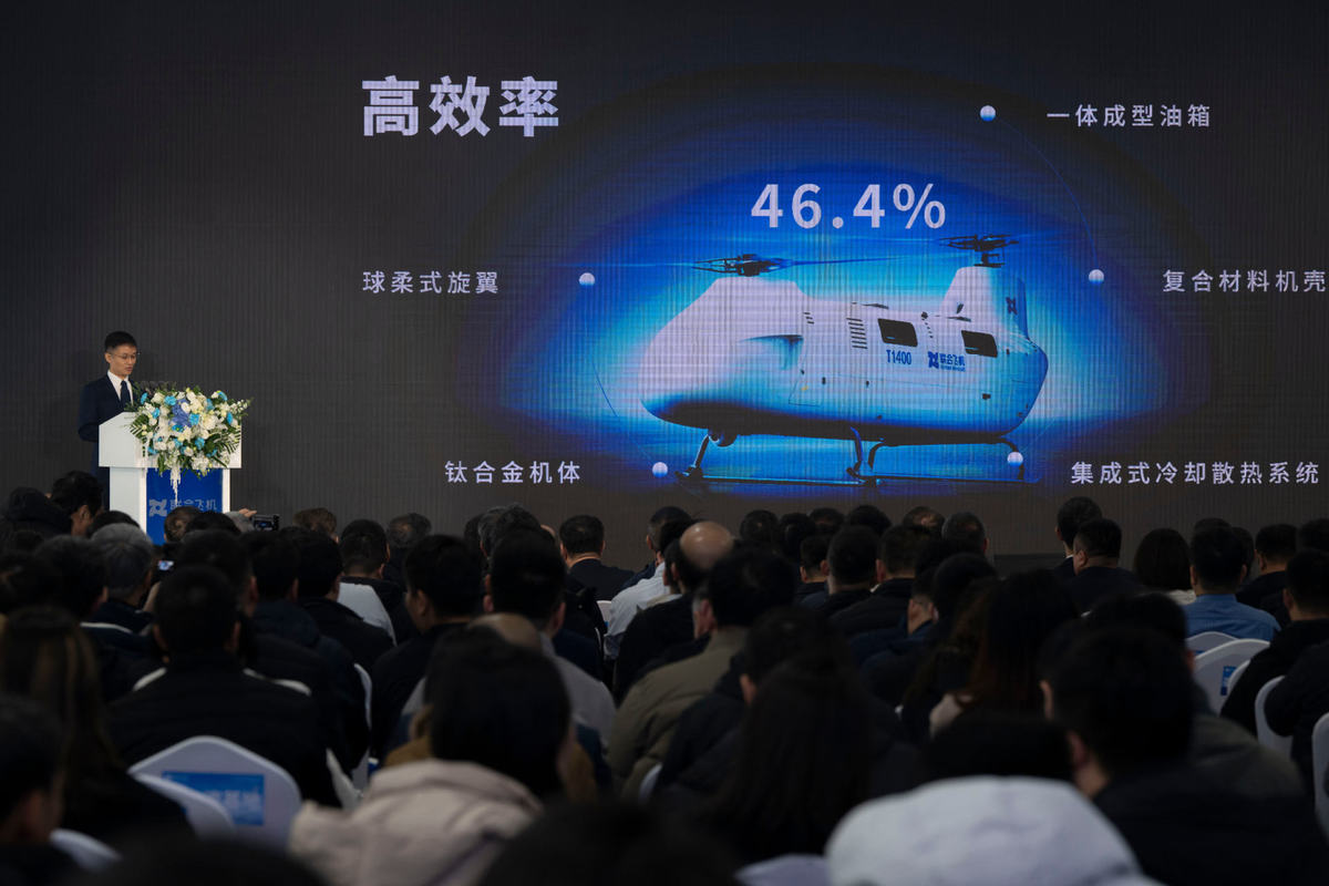 This photo taken on Oct 30, 2025 shows the maiden flight ceremony of Boying T1400 Tandem Rotor Unmanned Helicopter of United Aircraft in Harbin, Northeast China's Heilongjiang province. [Photo/Xinhua]