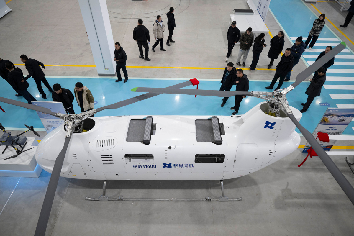 Guests visit the Boying T1400 Tandem Rotor Unmanned Helicopter at the factory of United Aircraft in Harbin, Northeast China's Heilongjiang province, Oct 30, 2025. [Photo/Xinhua]