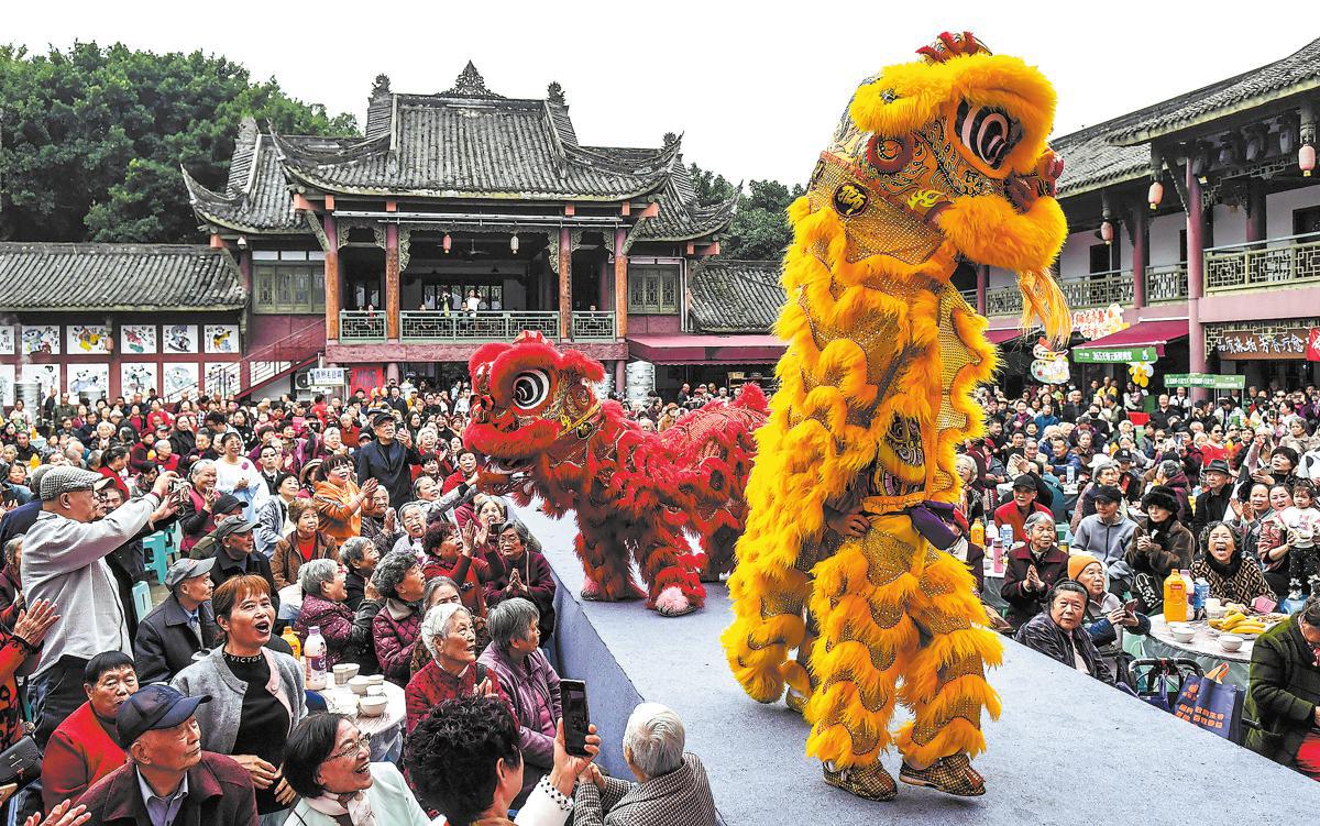 A lion dance is performed to entertain the seniors as part of activities celebrating Chongyang Festival, which honors and shows respect for the elderly, in Chengdu, Sichuan province, on Oct 28, 2025. LI XIANGYU/FOR CHINA DAILY