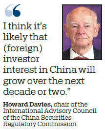 "I think it's likely that (foreign) investor interest in China will grow over the next decade or two," said Davies, who is also chairman of Inigo Insurance, a professor in practice at the Paris School of International Affairs and former chairman of the United Kingdom's Financial Services Authority.