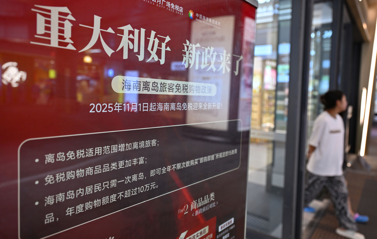 This photo taken on Nov 1, 2025 shows a board publicizing offshore duty-free policy in a duty-free shop in Haikou, South China's Hainan province. The island province of Hainan broadened the scope of its offshore duty-free goods by adding two new goods categories, namely pet supplies and portable musical instruments. After this adjustment which took effect on Saturday, the island's offshore duty-free shopping list covers a total of 47 goods categories. [Photo/Xinhua]