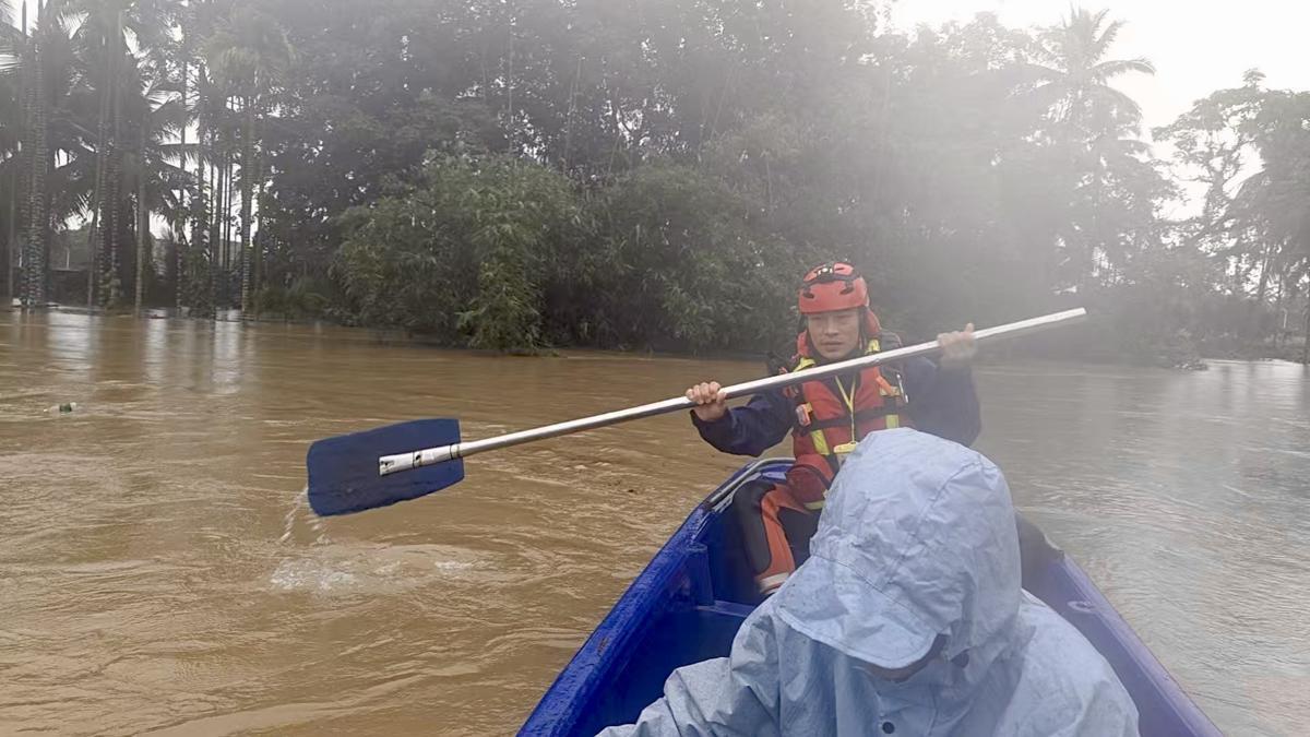 Qionghai's fire and rescue department responded to multiple emergencies on Tuesday. At noon, rescuers reached 25 trapped people near Wenqu Bridge in Wanquan town, where water depths reached around 4 meters. The group included students and elderly residents. Rescue personnel provided life jackets and transported all individuals to safety via rubber boats.