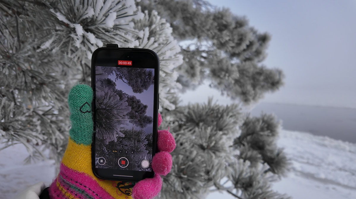 A local takes photos of the rime ice on the trees along the Heilongjiang River in Huma county in the Daxing'anling region of Heilongjiang province. [Photo by Wang Ting/For chinadaily.com.cn]