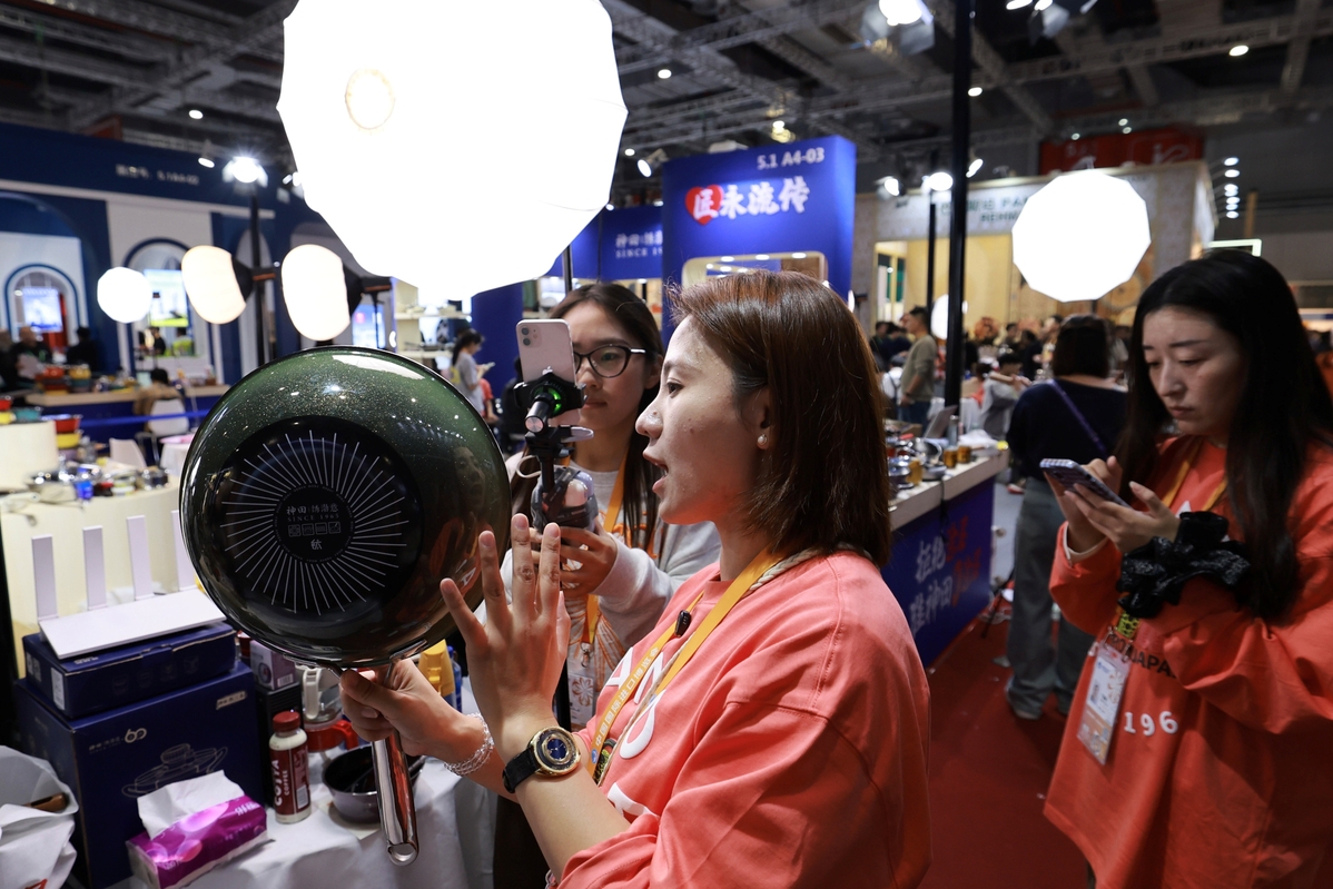 A host livestreams at the Consumer Goods exhibition area of the eighth China International Import Expo in East China's Shanghai on Thursday. [Photo by Zhang Wei/chinadaily.com.cn]