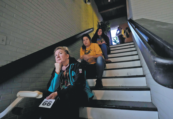 People wait to shop for food at the Irving Park Community Food Pantry in Chicago on Wednesday. NAM Y. HUH/AP