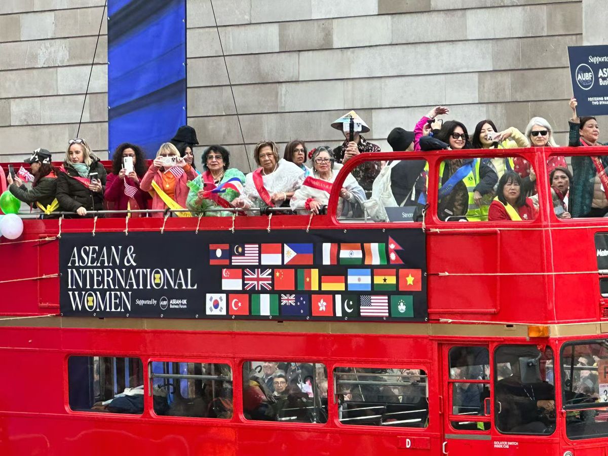 Representatives of the ASEAN and International Women group greet spectators from a red double-decker bus during the Lady Mayor's Show on Saturday in London. [Photo provided to chinadaily.com.cn]