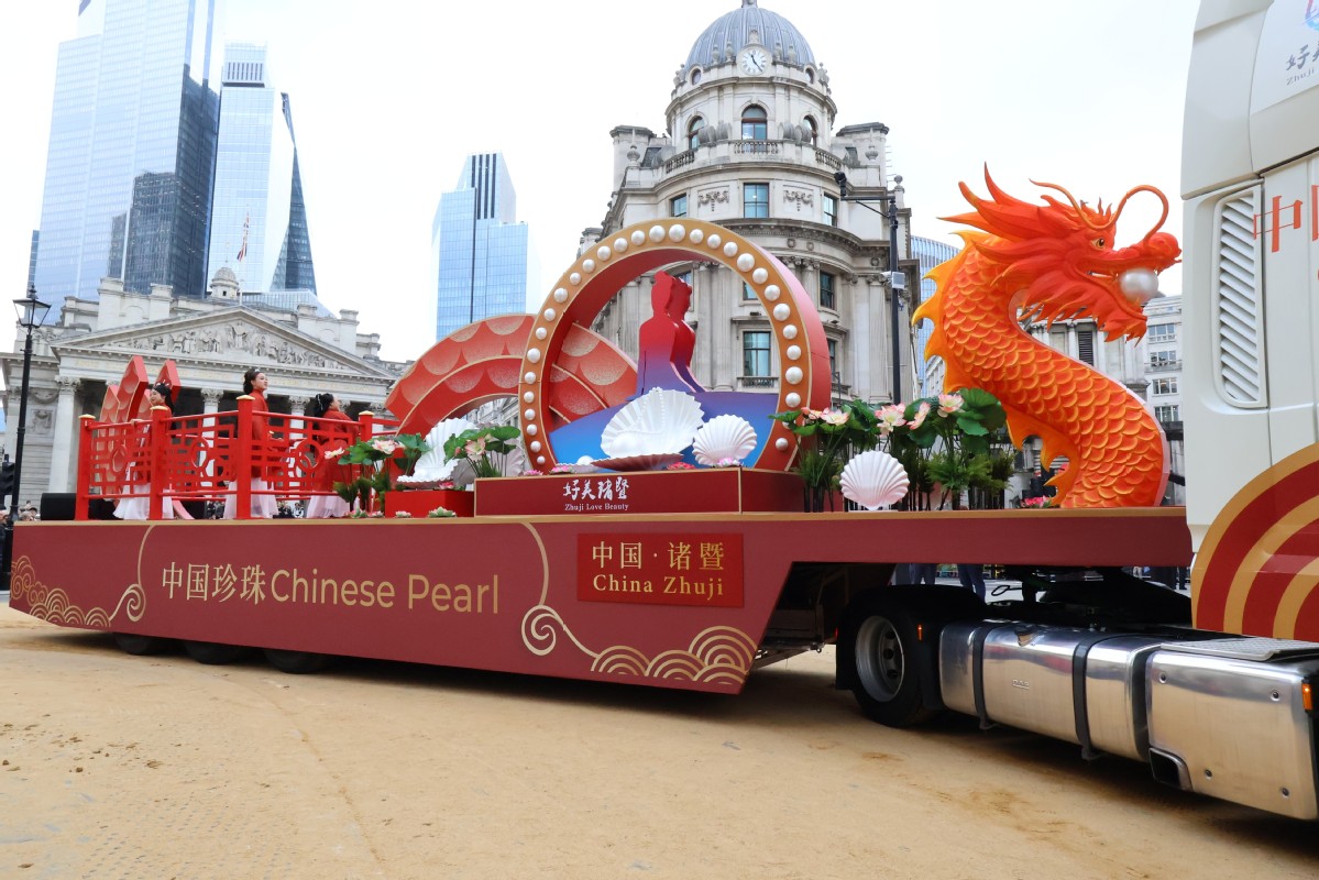 ZJUKA's float adorned with pearls, a dragon, and symbolic Chinese motifs is seen during the Lady Mayor's Show on Saturday in London. [Photo by Yang Yi/chinadaily.com.cn]