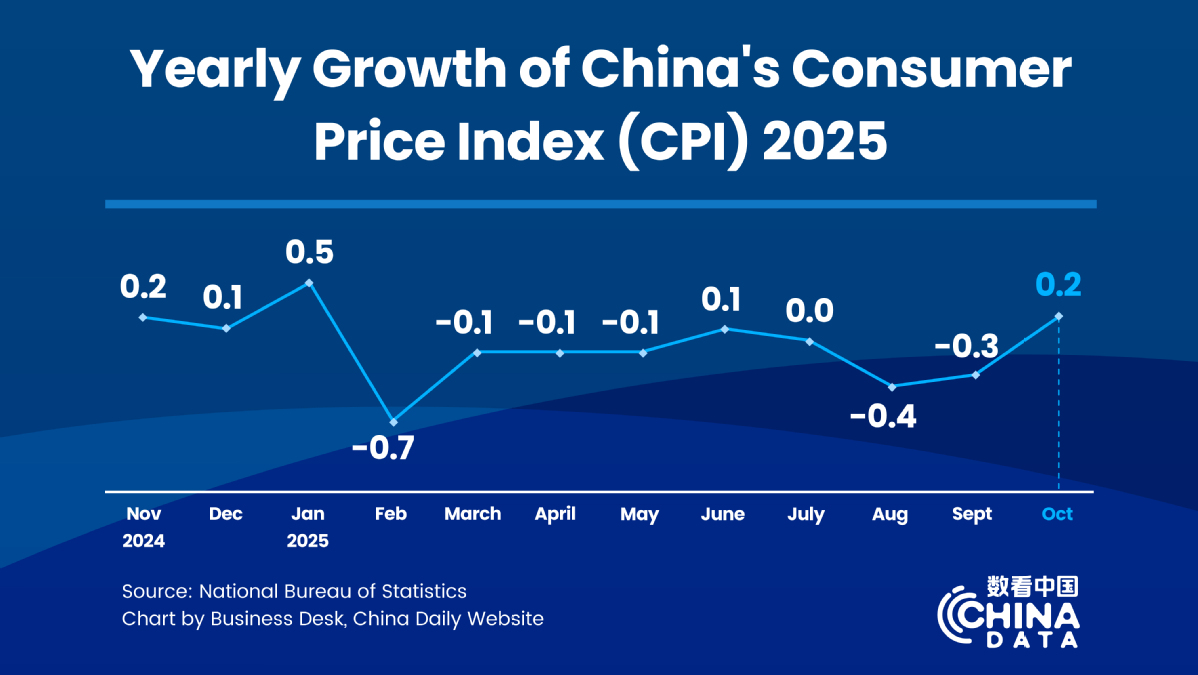 China's consumer price index, the main gauge of inflation, rose by 0.2 percent year-on-year in October, following a 0.3 percent drop in September, according to the National Bureau of Statistics (NBS).
