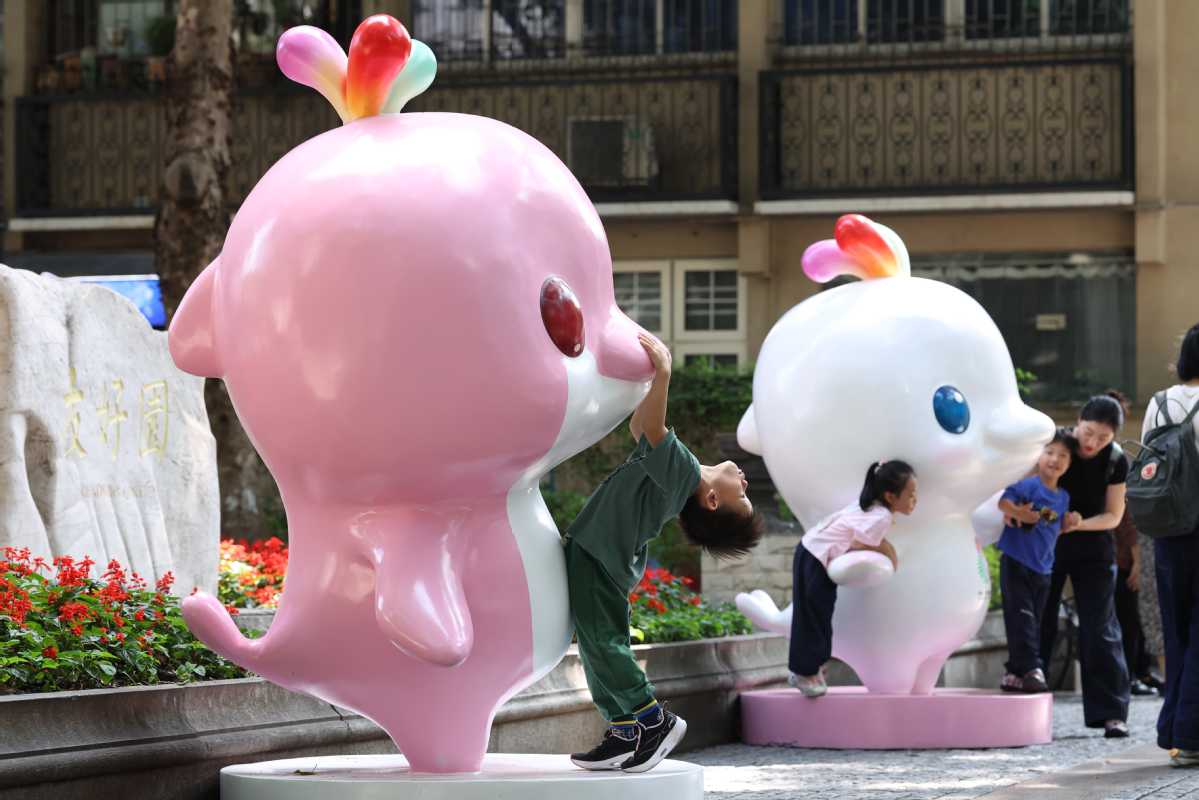People take pictures with the 15th National Games mascot sculptures, "Xiyangyang" and "Lerongrong", on Shamian Island in Guangzhou, South China's Guangdong province, on Saturday. [Photo by Wei Xiaohao/chinadaily.com.cn]