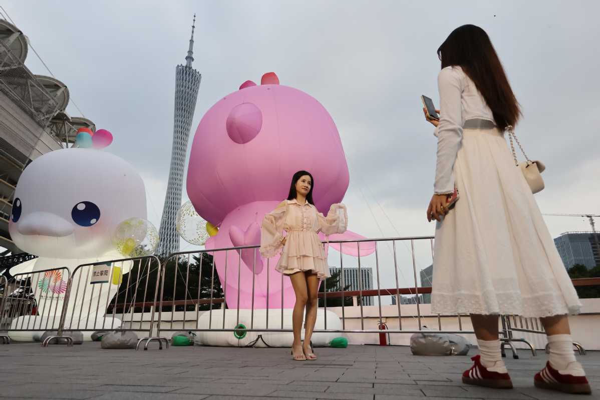People take pictures with the 15th National Games mascot sculptures, "Xiyangyang" and "Lerongrong", close to Canton Tower in Guangzhou, South China's Guangdong province, on Saturday. [Photo by Wei Xiaohao/chinadaily.com.cn]