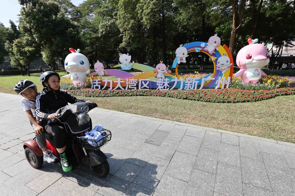 Residents pass decorations for the 15th National Games on Guangzhou Avenue in Guangzhou, South China's Guangdong province, on Saturday. [Photo by Wei Xiaohao/chinadaily.com.cn]