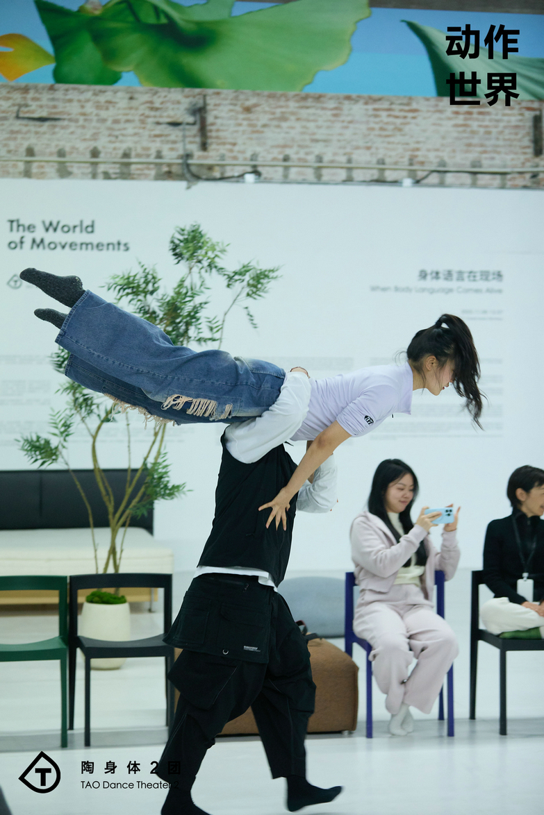 The photo shows a man carrying a woman at The World of Movements at the 798 Art Factory in Beijing, on Nov 7, 2025. [Photo provided to chinadaily.com.cn]