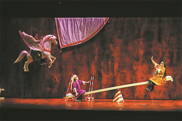 Three ministers play on a seesaw and a wooden horse in a reimagined version of Turandot staged at the Shaanxi Opera House in Xi'an, Shaanxi province, on Nov 9. [Photo/Xinhua]