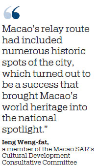 "Macao's relay route had included numerous historic spots of the city, which turned out to be a success that brought Macao's world heritage into the national spotlight," he said.