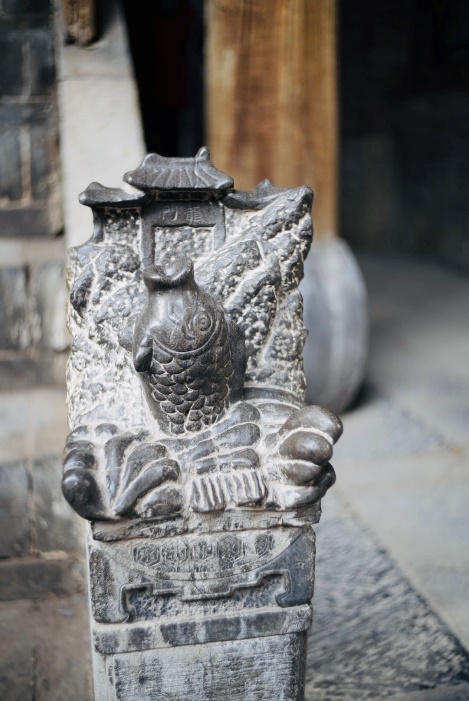 A small post by a stairway, easily overlooked, shows a fish rising out of the water. The scene tells the story of a carp that battled its way through Dragon's Gate to become a dragon. Its message is a reminder not to rest on one's laurels but to work hard for a better future.