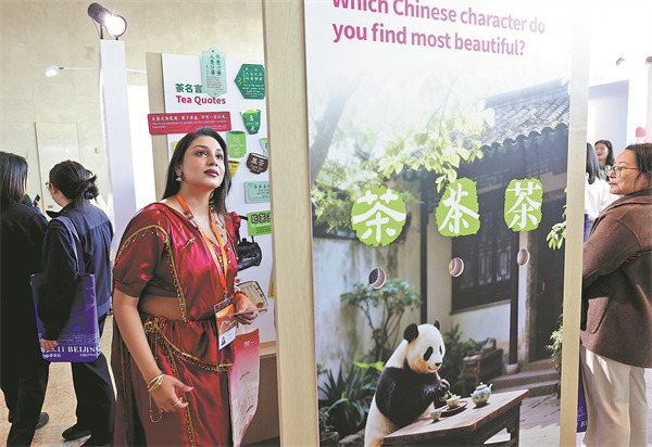 An international participant at the World Chinese Language Conference visits a mini-exhibition on China's tea culture. [Photo provided to China Daily]