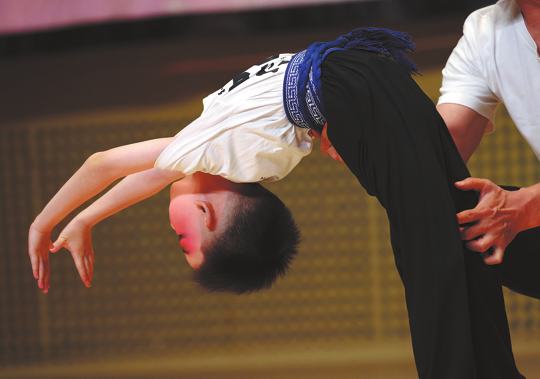 A instructor helps a child complete a basic opera movement during the event. ZHU XINGXIN/CHINA DAILY