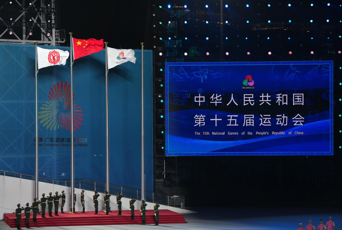 Photo taken on Nov 21, 2025 shows the Chinese national flag at the closing ceremony of China's 15th National Games in Shenzhen, south China's Guangdong province. [Photo/Xinhua]