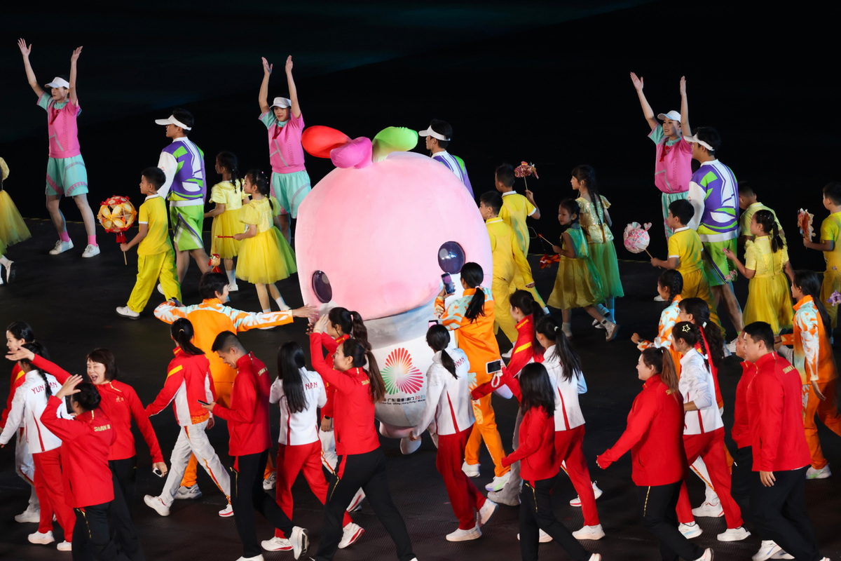 Mascots interact with members of delegations during the closing ceremony of China's 15th National Games in Shenzhen, south China's Guangdong province, Nov 21, 2025. [Photo by Parker Zheng/chinadaily.com.cn]