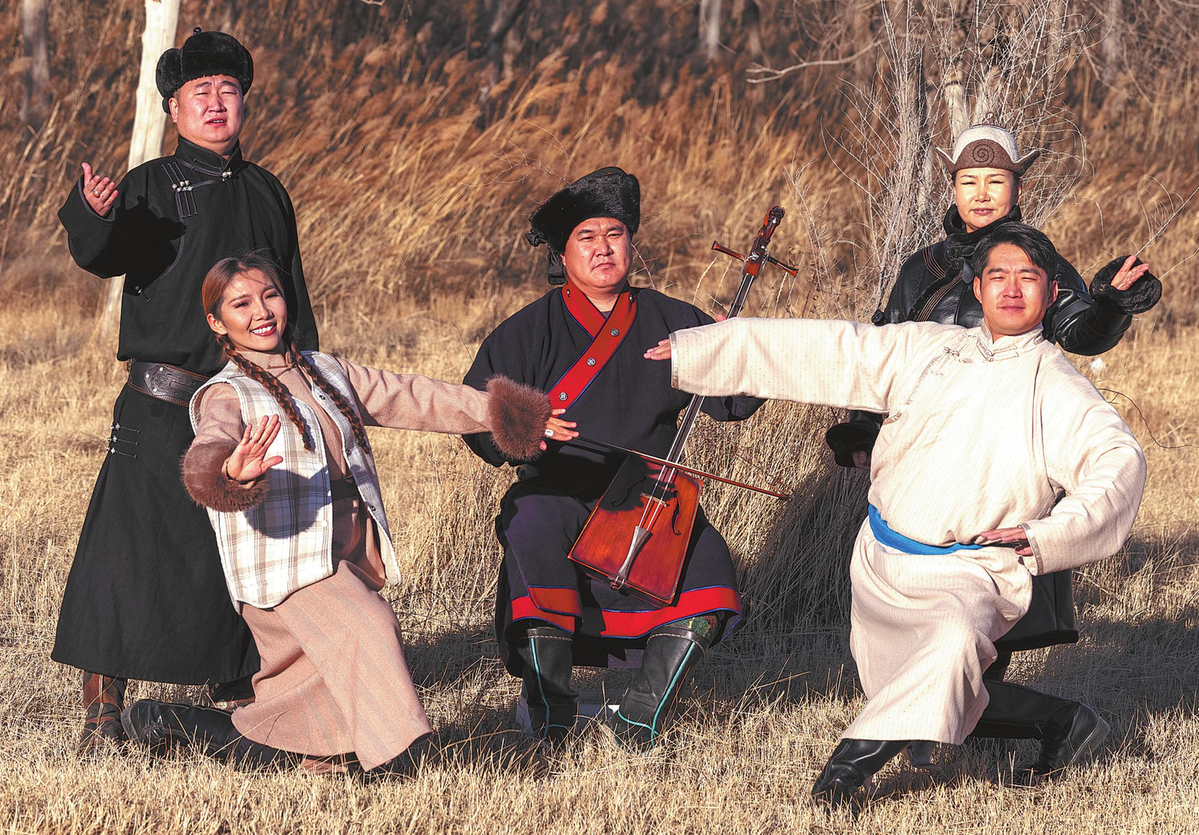 In the prairie of Xiliin Gol League in the Inner Mongolia autonomous region, troupe members rehearse, performing songs and dances depicting the daily lives of local herders. MA JINRUI/XINHUA