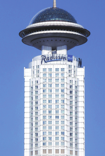 His photos highlight signature elements of the era such as colorful glass curtain walls, geometric windows, signal-tower spires, and flying saucer-shaped revolving restaurants.