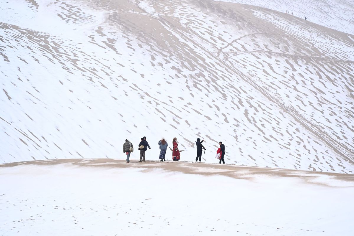 Tourists visit the Mingsha Mountain and Crescent Spring Scenic Area in Dunhuang city, Northwest China's Gansu province, on Nov 23, 2025. [Photo/Xinhua]
